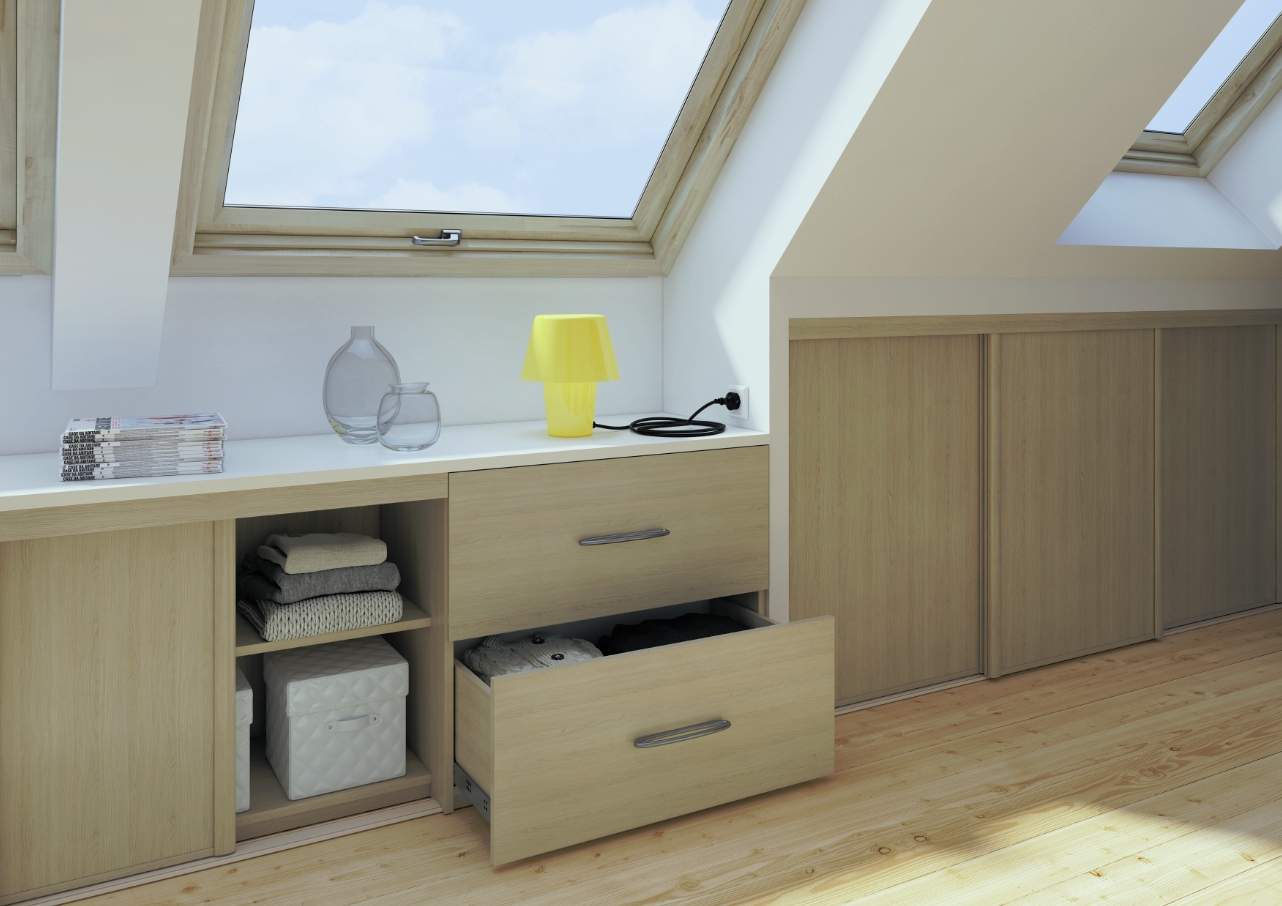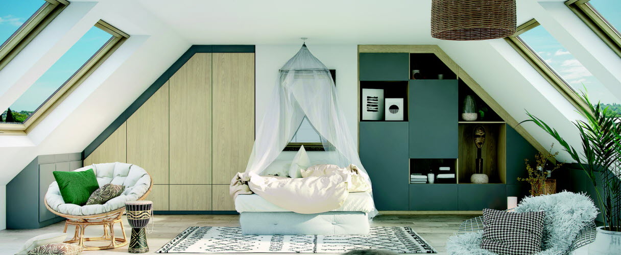 Au contraire, lorsque la pente du toit est douce, tout l’espace qui longe la base du plafond incliné n’est plus habitable. C’est donc dans ces zones dont la hauteur est inférieure à 1,5 m qu’il faut installer les éléments de rangement. Et ainsi rentabiliser des espaces difficiles à investir au quotidien. Il suffit de fermer l’angle du toit par des étagères équipées de portes coulissantes. Une planche à hauteur de table posée sur toute la longueur de la pièce peut également servir de bureau sous lequel on aménagera des placards.