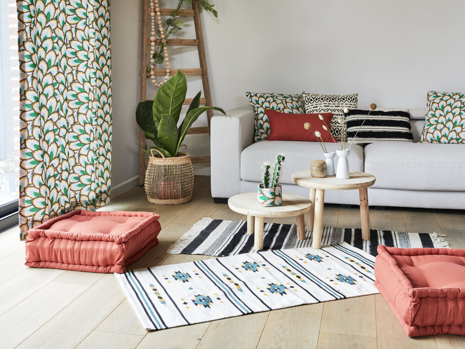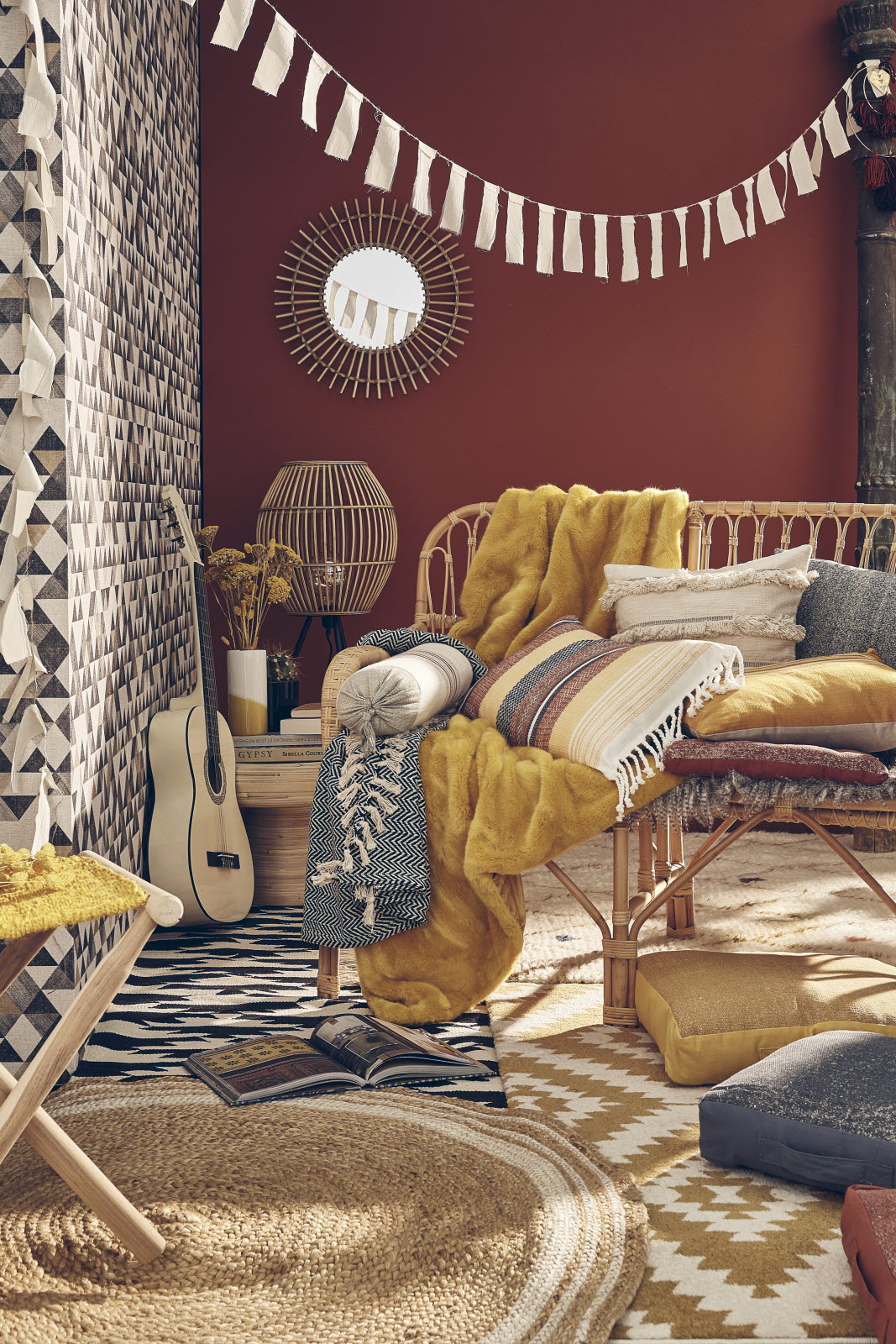 Les matières naturelles sont la marque du style bohème, tout comme la confection manuelle : bois, métal, terre cuite, fibres végétales, plumes… La palette des couleurs est donc toujours chaude, jouant sur des dégradés de beige et de brun. Les textures sont brutes et les multiples contrastes de matières sont unis dans des camaïeux doux et chaleureux.